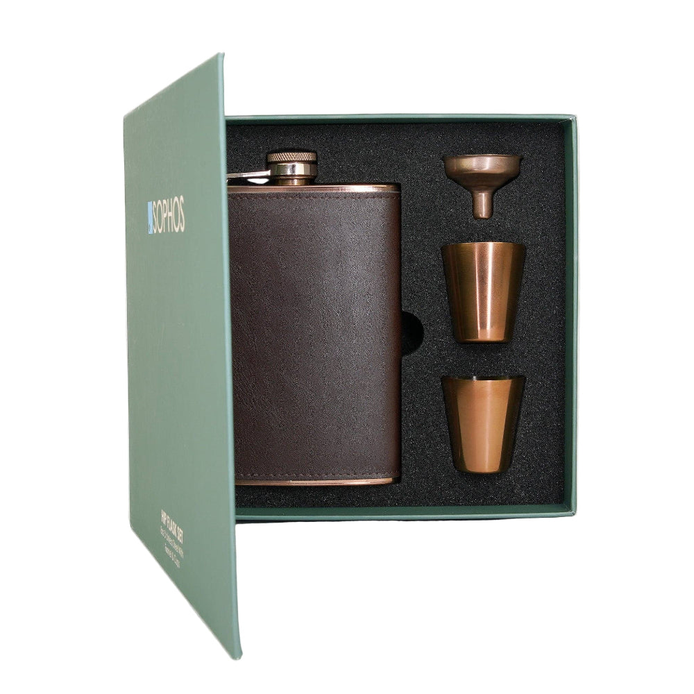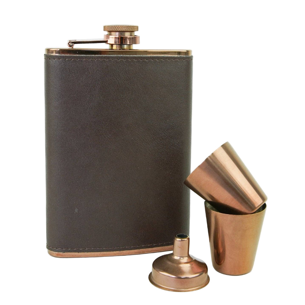 Vores 4-delt kobber lommelærke flaskesæt inkluderer en 8 oz kolbe, 2 kopper og en tragt til nem genopfyldning. Perfekt til eventyr på farten eller som en unik gave. PU beklædning