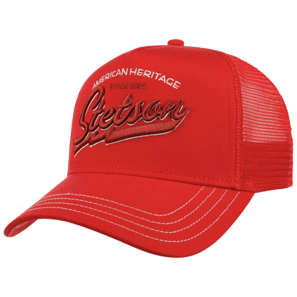Vacker varm röd enfärgad vintage Stetson baseballkeps i Trucker Cap-stil med Stetson-logotyp och American Heritage-tagline.